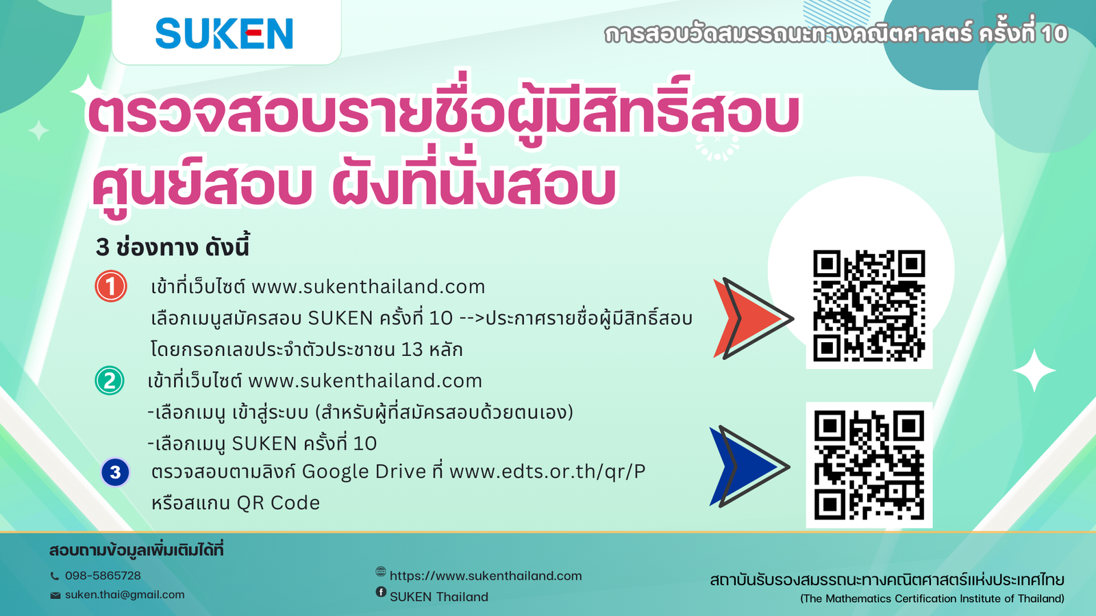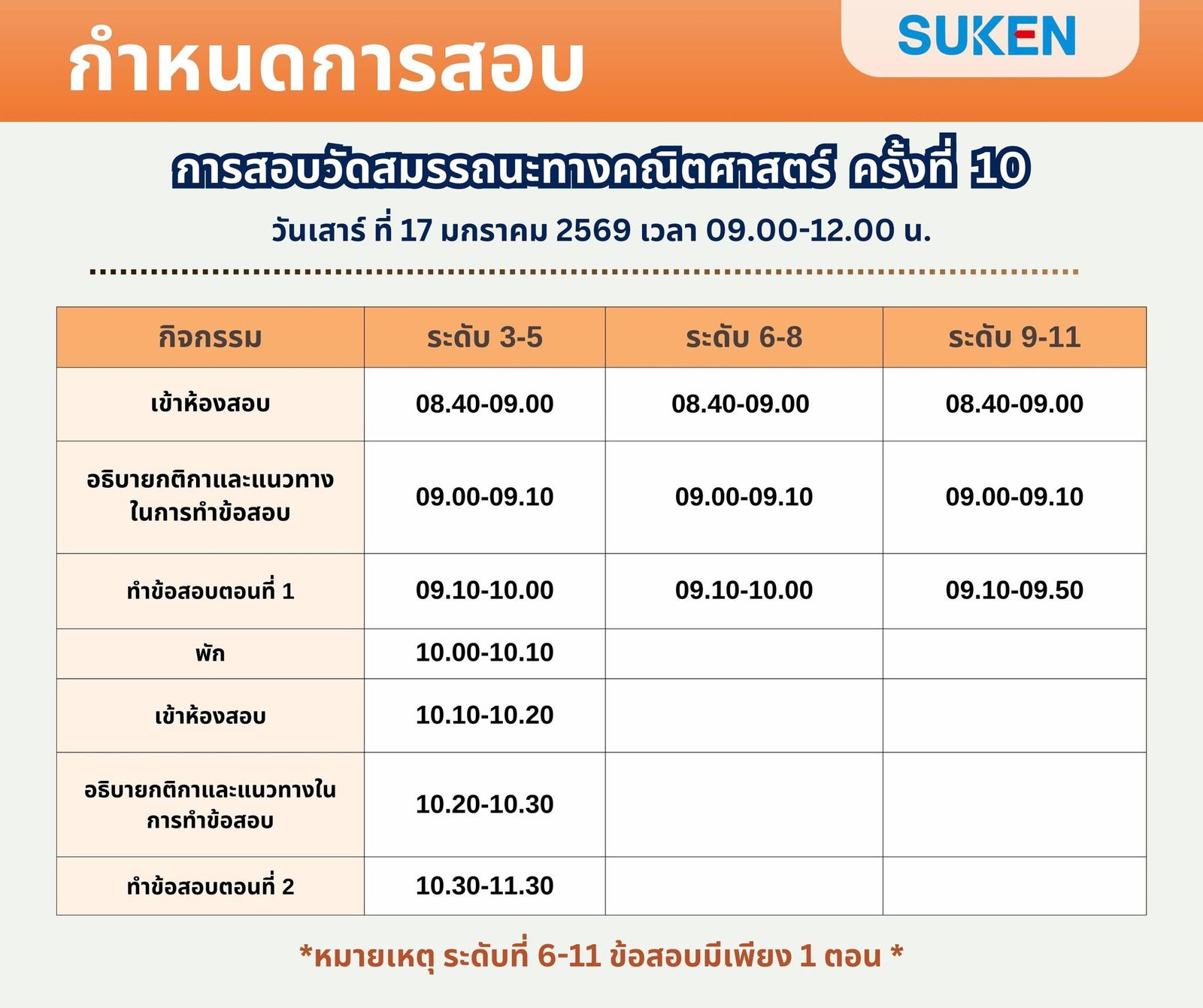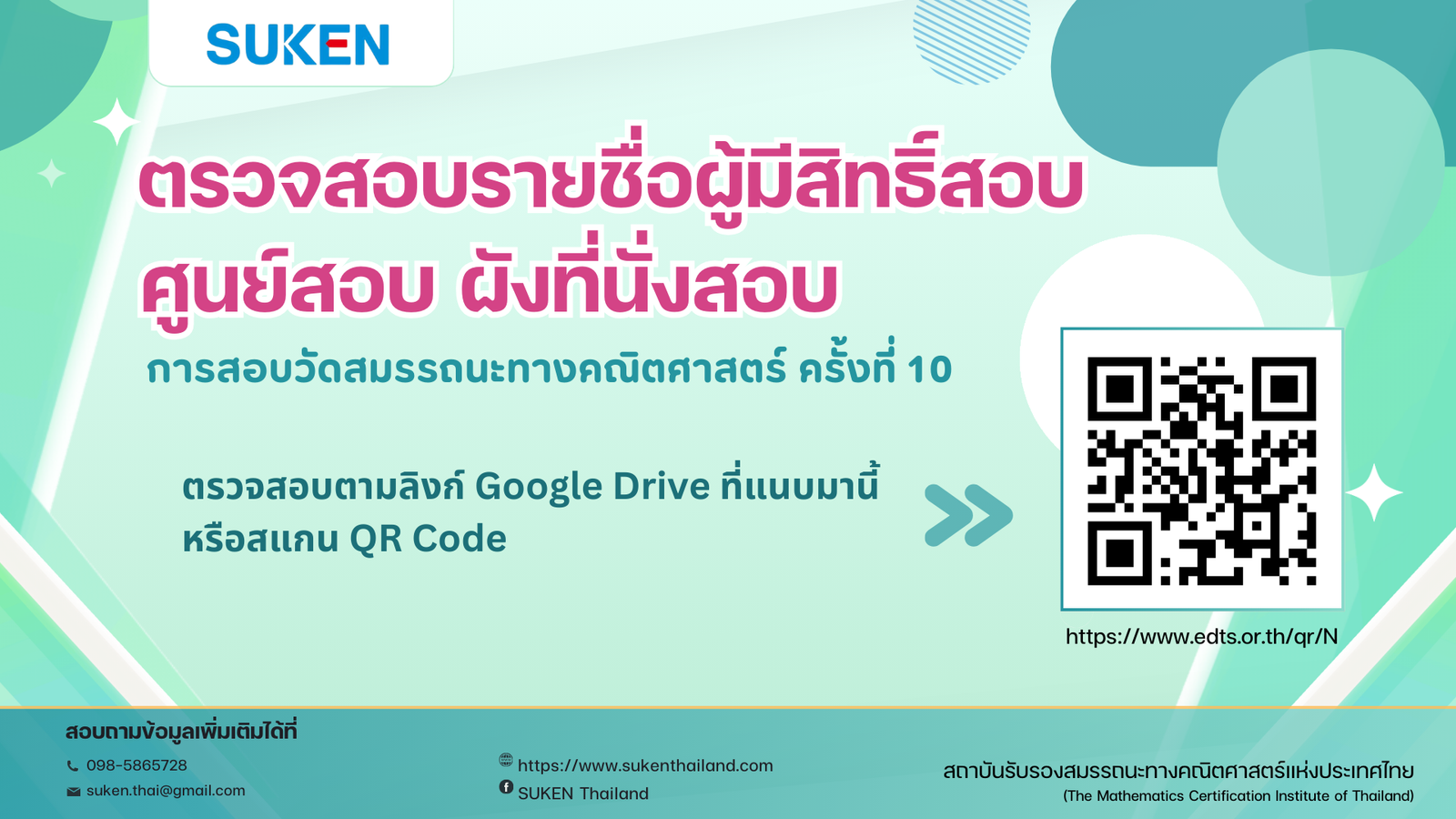 ประกาศสถานที่สอบ การสอบวัดสมรรถนะทางคณิตศาสตร์ (SUKEN) ครั้งที่ 10